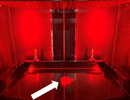 Only the first base layers have been formed attached to the platform, the rest of the print (arrow) is in the vat.